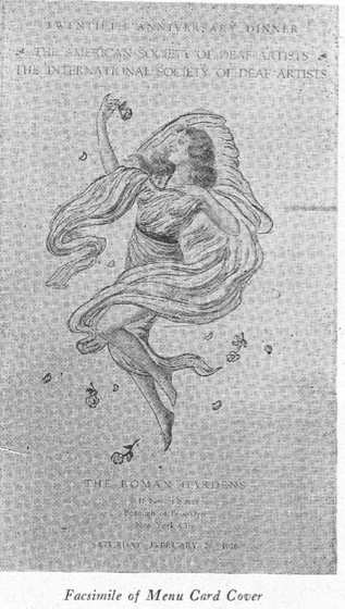 - American Society of Deaf Artists: Their Recent Dinner at the roman Gardens, Brooklyn, NY, Silent Worker, May 1927, p. 286 http://dspace.wrlc.org/view/ImgViewer?url=http://dspace.wrlc.org/doc/manifest/2041/40148